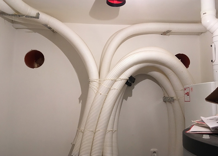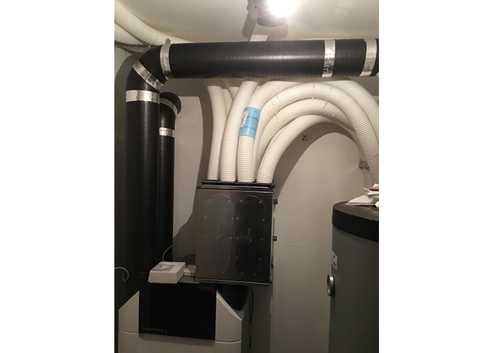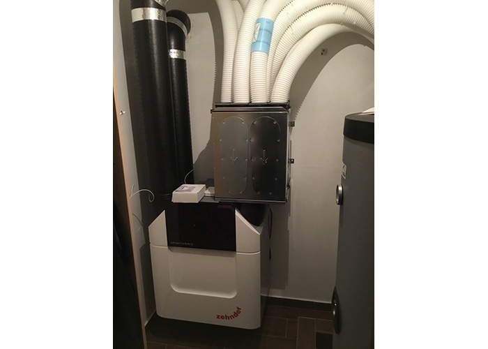 A tulajdonos építette ki az alapcsővezetékrendszert. Mi a Zehnder Comfoair Q350 szellőztetőgépet és a hangcsillapított osztó-gyűjtőket telepítettük, a szellőztetőgépet beüzemeltük, a rendszert beszabályoztuk, azaz mindenhová a számitott légmennyiség lett beállítva.